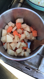 Vern cooked us a nice breakfast of French toast and bacon and so I reciprocated by making chicken curry for dinner. I bought the seasoning packets at the food market in Parker and I carry the coconut milk with me. I buy it on Amazon and today I learned that the seasoning packets can be purchased there also so I’m going to buy a case of each because it makes such an easy meal to share with others. I just cut up one potato and one sweet potato and one onion and used a can of chicken with the curry paste and the coconut milk and Buddy was it good!