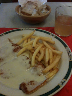 I've purchased the Menu del Dia from the bar behind my pension. This mid day meal is large with two courses plus dessert and drink. I had a HUGE mixed salad first course, then this Lomo Roquefort which I think was pork loin with a Roquefort sauce.