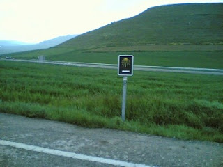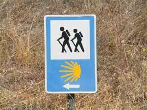 In Spain, the official mark is the stylized scallop shell on a blue background, which is often placed on the walls of houses well above eye level to indicate the route through villages and towns. In open country, one frequently encounters these signs are often found embedded in small concrete pillars. There are also signboards with this mark at the top, a pedestrian sign in the middle, and a direction arrow at the bottom; these are much used at road crossings.