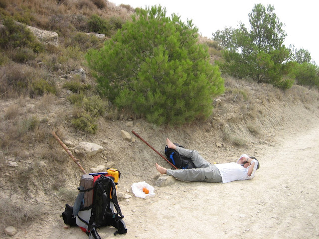 It was very hot walking, and I was happy to lay down in the dirt and rest. I am wearing the pajama top I nabbed at the last albergue from the free box. I slit the underarms to get air. The top protected me from the sun quite well!