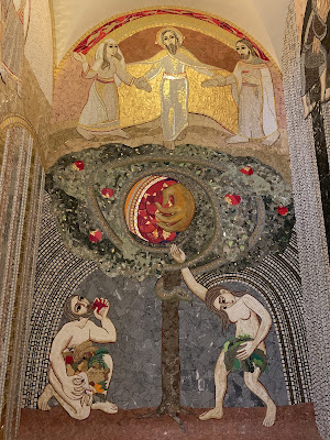 All around the sanctuary are these huge gorgeous glass mosaics. They sparkle, which I cannot catch with my camera. There are signs telling you not to touch them because you might get cut on the glass.